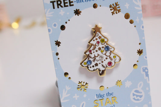 Christmas tree enamel pin - Gold and white with colorful rhinestones - For a bright Christmas