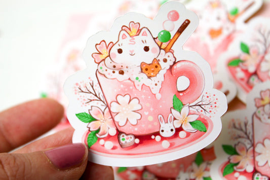 Spring Cafelini - Sakura Latte - Cute, foamy cappuccino cats - PAPER or VINYL Sticker