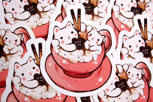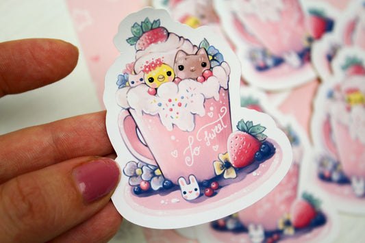 Spring Cafelini - Strawberry Latte - Cute, foamy cappuccino cats - PAPER or VINYL Sticker
