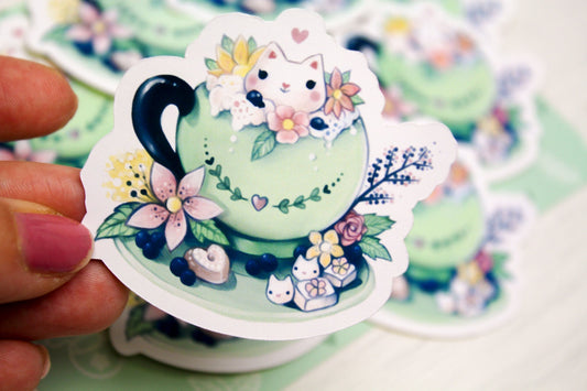 Spring Cafelini - Matcha Latte - Cute, foamy cappuccino cats - PAPER or VINYL Sticker
